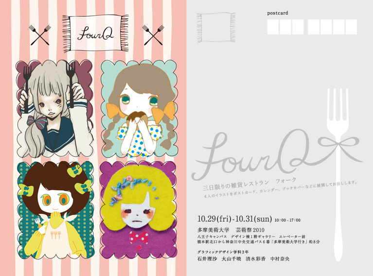昨年AtoZとして参加した芸祭ですが今年は同じメンバーがfourQという雑貨屋さんとしてまた再結集しました。AtoZの続きとしてポストカードの展示販売プラス、カレンダー、ペンケースやバッチ、ブックカバーなどの創作雑貨の販売もする予定です